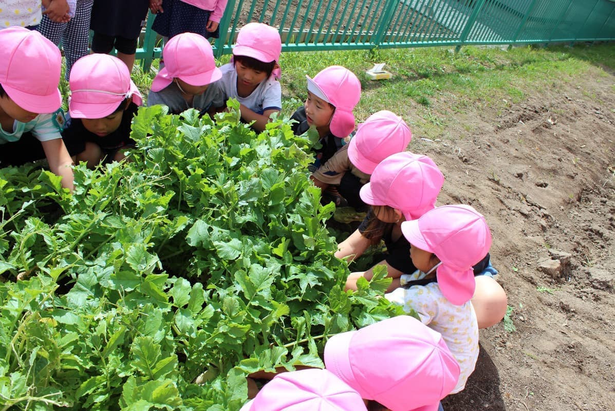 園舎に畑を作り、たね、苗を植えて作物を作っています。雑草取りをして、収穫し、それを給食の食材として食育に活かしています。