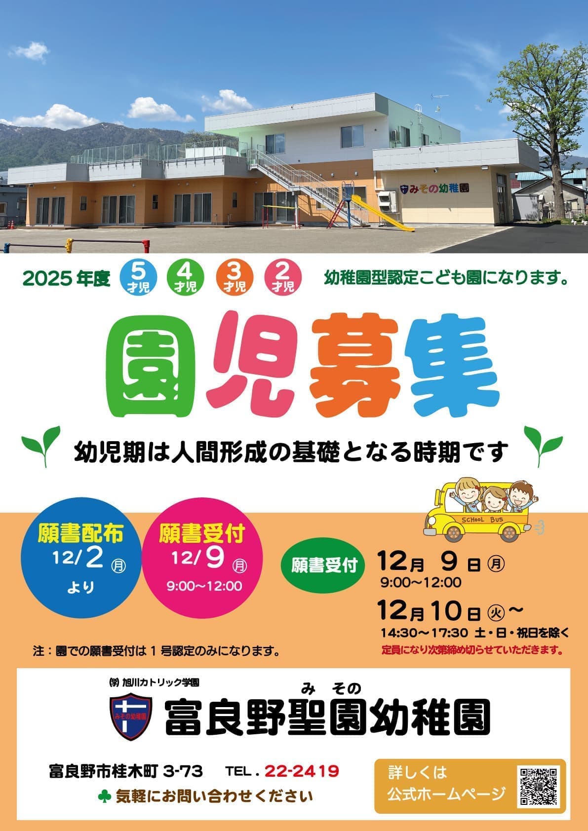 12月2日〜12月23日迄に富良野市こども未来課(居住する市町村)に直接提出、その後審査を受けます。結果は2月中旬頃に通知されます。決定後に上記のように幼稚園の入園受付・面接を行います。その際、入園申込書・家庭環境調査表・通園図を提出してください。